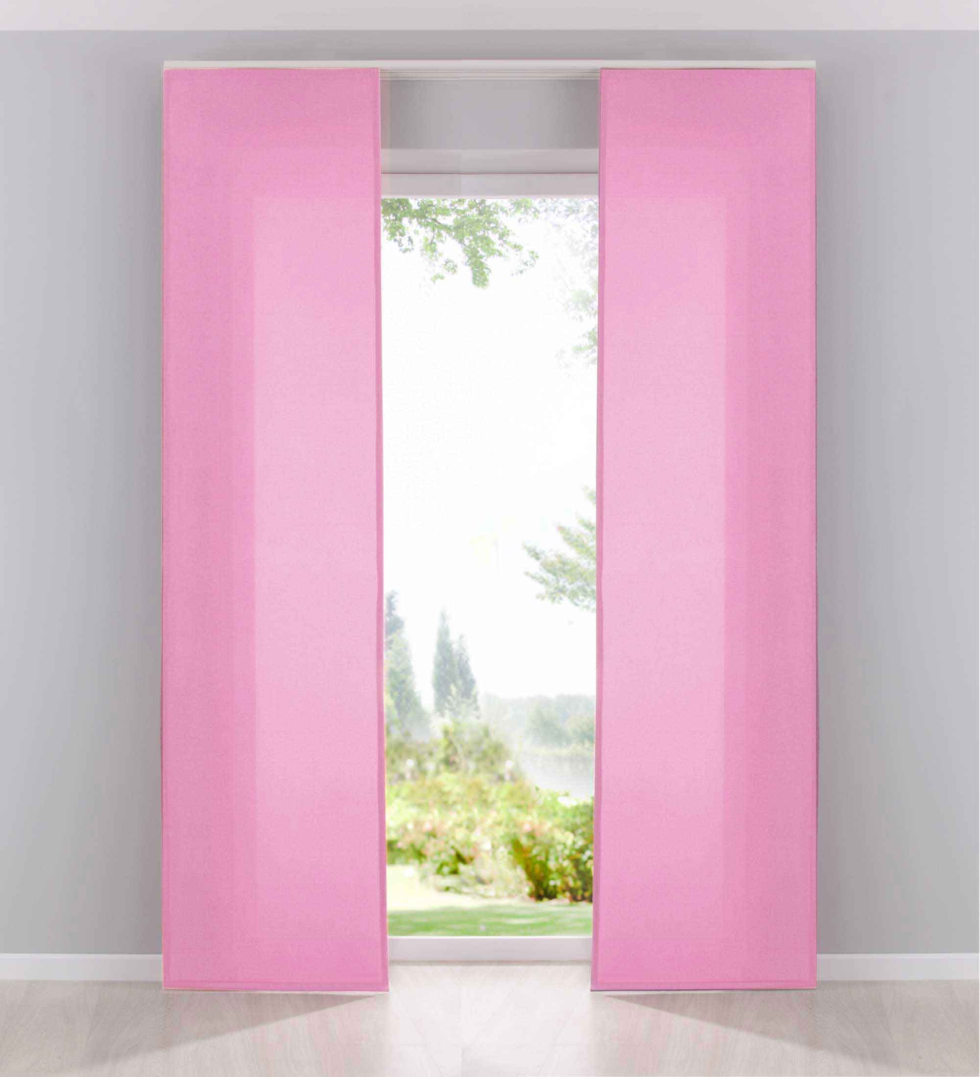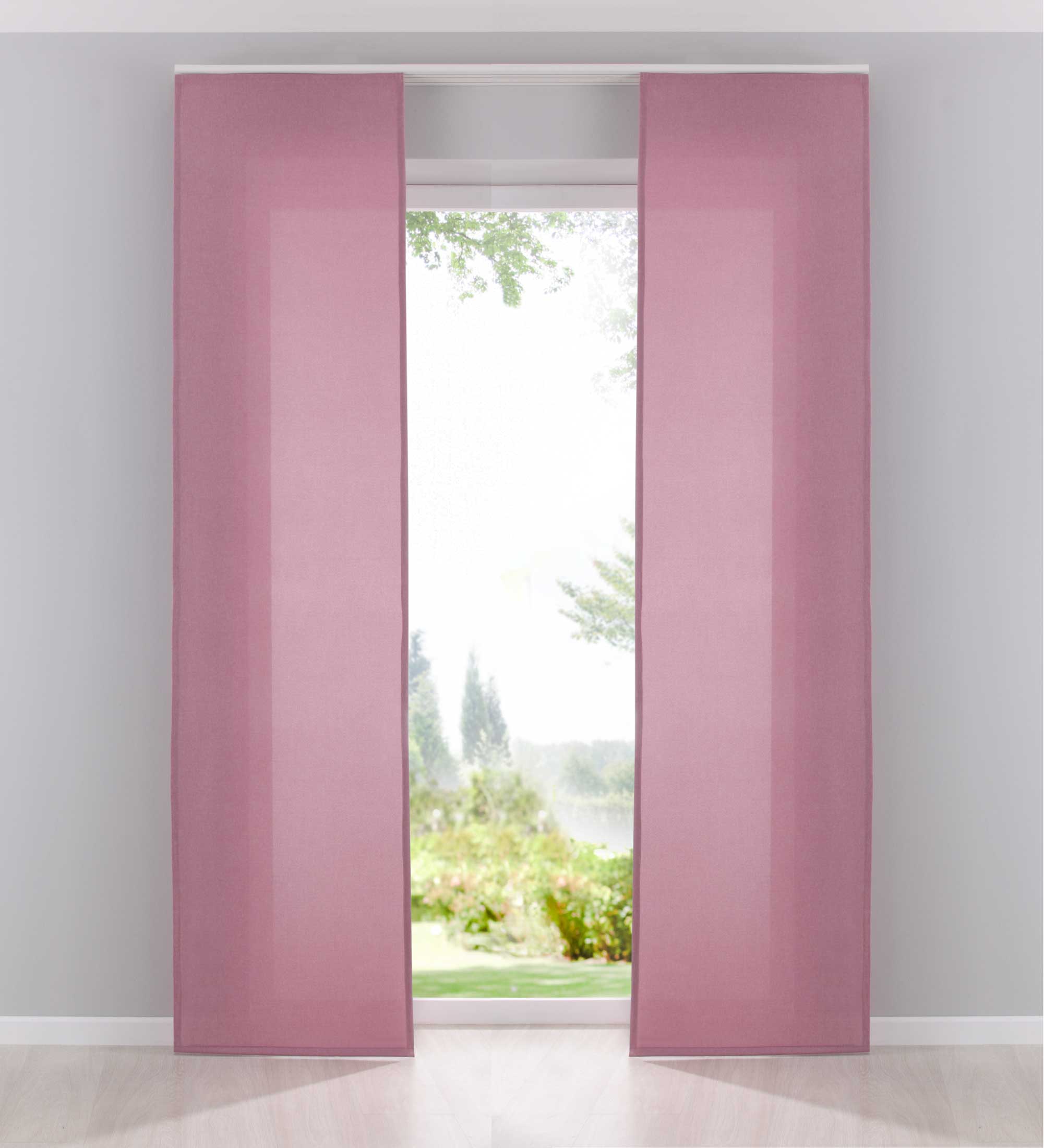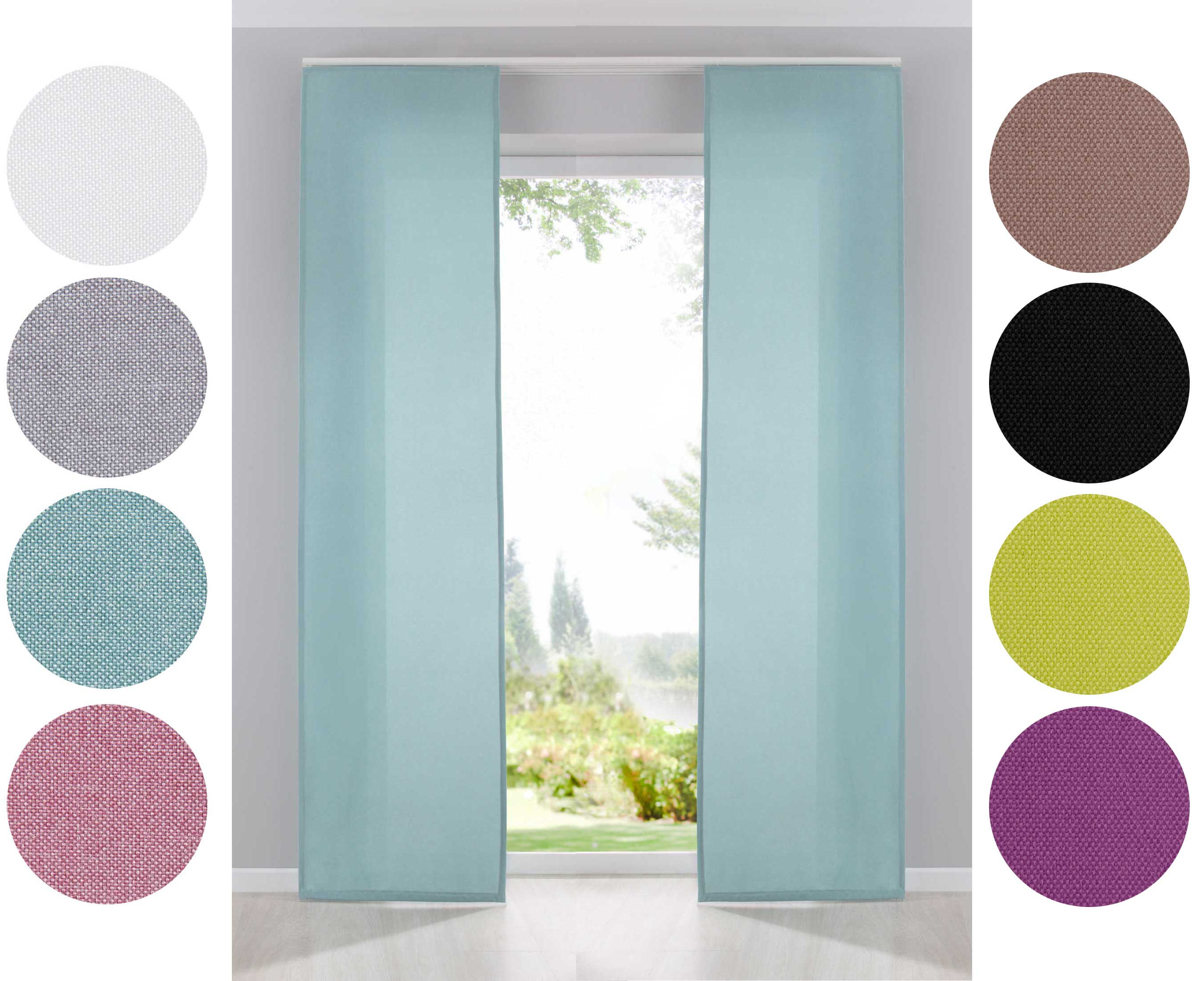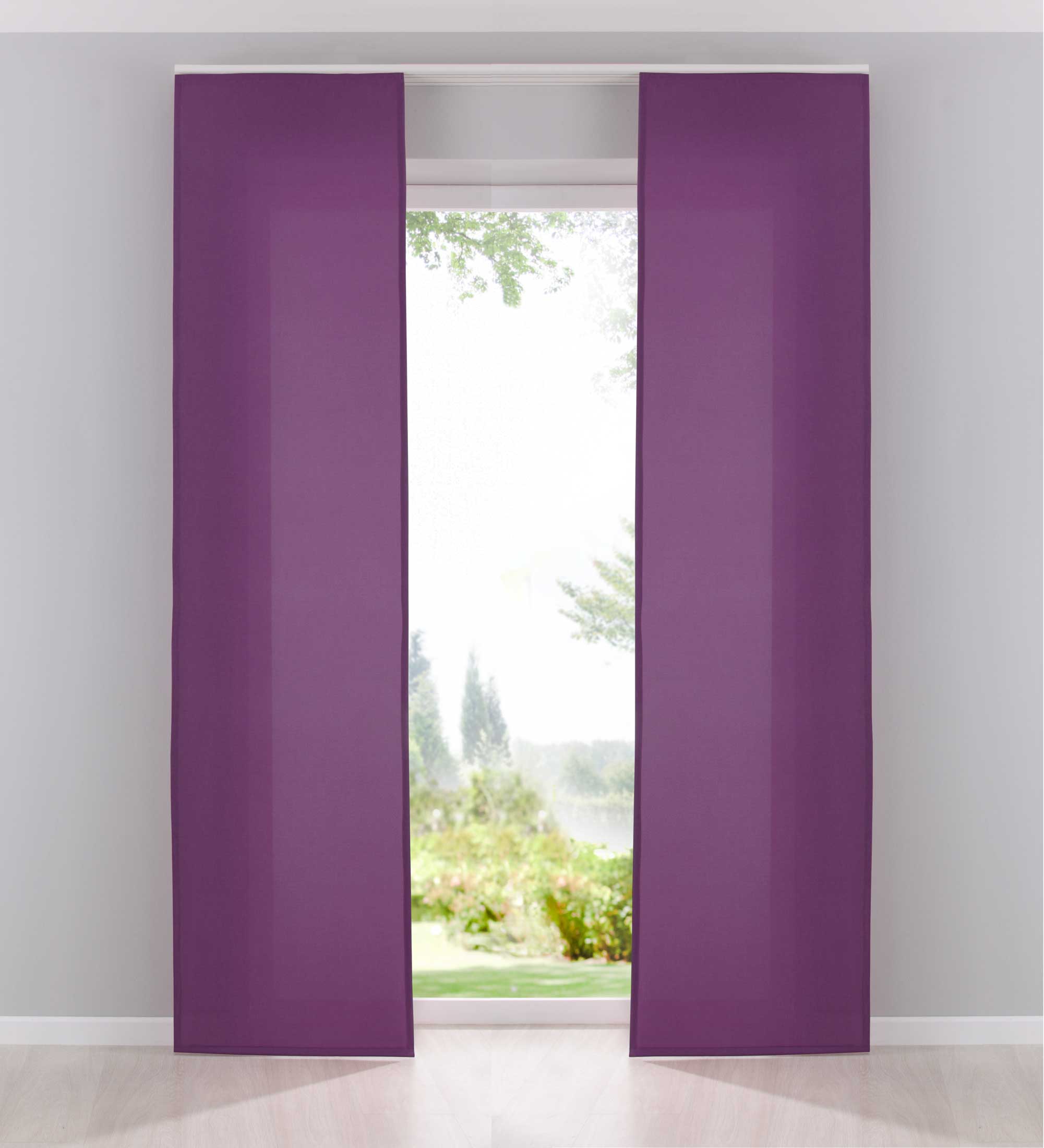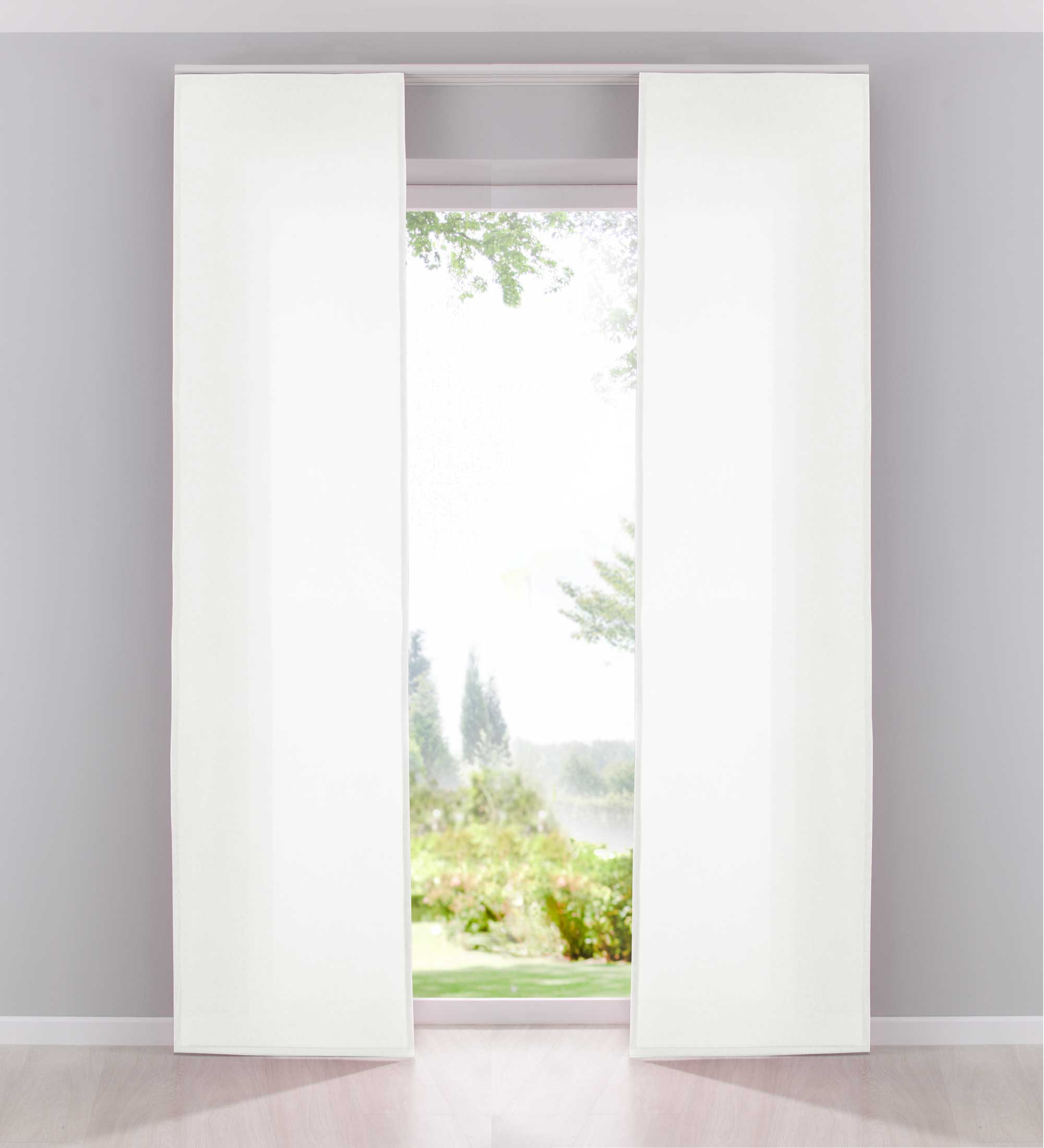 Die Vorhänge werden mit praktischen Klettschienen, Beschwerungsstangen und Paneelwagen geliefert. Passend für alle gängigen Deckenschienen mit 2 verschiedenen Gleitsystemen.