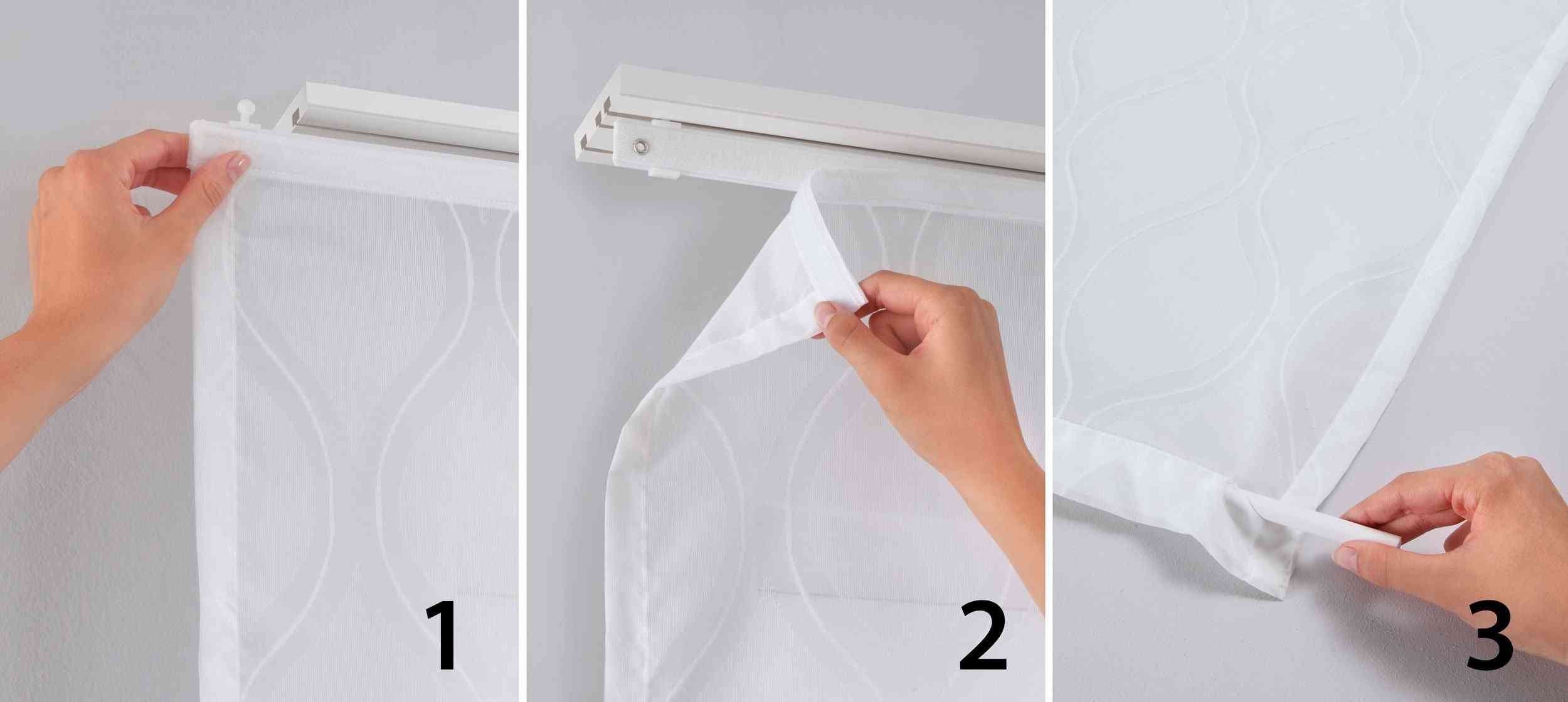 Befestigung mit Flauschband einfach abnehmbar und leicht anzubringen, Die Gardinen sind mit Klettband incl. Paneelwagen und Beschwerungsstange ausgestattet. Sie sind sowohl für Gardinenschienen oder Gardinenstangen mit innenlauf geeignet.